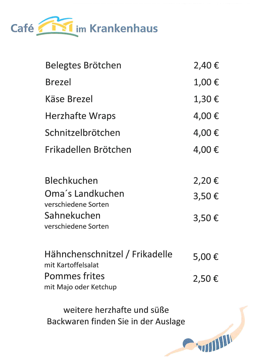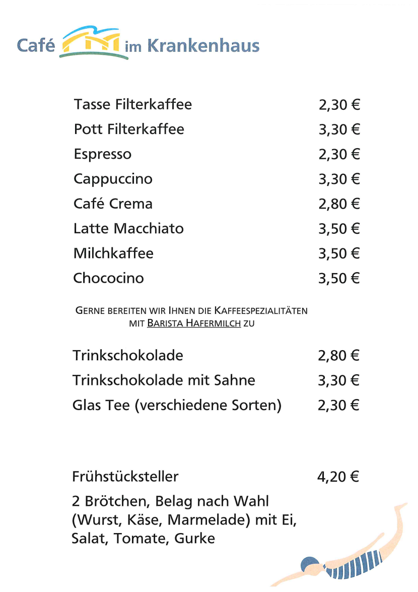 neben süßen und herzhaften Snacks vom Donut bis zum Wiener Würstchen gibt es auch kalte Getränke, Schokolade und natürlich Kaffee in zahlreichen Variationen. Mitarbeiter und Besucher haben die Möglichkeit, sich zwischendurch zu verpflegen, vor allem der Mittagstisch ist bei vielen sehr beliebt.Und natürlich soll das Café allen Besuchern und Patienten den Aufenthalt versüßen. Die Räumlichkeiten laden ein, sich ganz entspannt zurückziehen. Neben leckeren Speisen gibt es zudem eine große Auswahl an Tageszeitungen, Zeitschriften und praktischen Hygieneartikeln, die den Aufenthalt noch angenehmer machen.